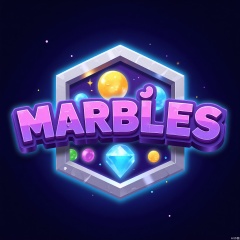 YXLG, Digital artwork showcasing the game logo "MAGIC MARBLES" in a whimsical, cartoonish font. The text is in a vivid purple with a 3D effect, giving it an otherworldly pop. The background is a deep navy blue gradient with a hexagonal silver border. Inside the hexagon are marbles of various colors swirling around, and at the center is a small, glowing crystal marble. The design exudes a playful and magical vibe.