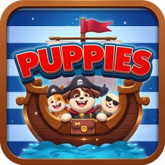 YXLG, Digital artwork presenting the game logo "PIRATE PUPPIES" in a swashbuckling, cartoonish font. The text is in a bold red with a 3D effect that makes it stand out like a pirate flag. The background is a navy blue and white striped gradient with a ship - shaped brown border. Inside the ship are puppies with pirate hats and eye - patches, and in the center is a dog bone treasure chest. It has a fun and pirate - themed feel.