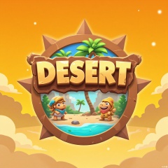 YXLG, Digital artwork displaying the game logo "DESERT DINOS" in a rugged, cartoonish font. The text is in a sandy beige with a 3D effect that makes it look like it's been carved into the desert sand. The background is a golden yellow and orange gradient with a cactus - shaped brown border. Inside the cactus are dinosaurs with desert - themed accessories, and in the center is an oasis with a palm tree. It has a playful and prehistoric - desert feel.