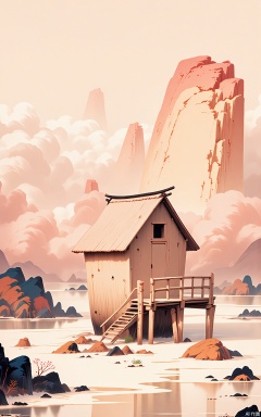 SSH, A surreal, abstract digital illustration of a small, thatched - roof pavilion perched on the edge of a serene lake. The pavilion has a light brown color, like the wood it's made of. It is surrounded by soft, pinkish clouds that reflect in the calm lake and set against a pale peach sky. The pavilion is constructed of simple wooden beams and posts, some with weathered marks, arranged in a traditional Chinese architectural style. The style is reminiscent of a dreamlike, almost ethereal, traditional Chinese water - color painting with a minimalist and modern aesthetic. The overall composition is balanced, with the pavilion taking up most of the frame, and the lake and clouds adding a sense of scale and depth.