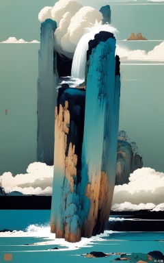 SSH, A surreal, abstract digital illustration of a large, ancient waterfall cascading down a steep cliff. The waterfall has a white color, and the cliff is a dark gray. It is surrounded by thick, white clouds of mist and set against a pale blue - green sky. The waterfall is powerful, with water splashing everywhere, and the cliff is rugged and imposing. The style is reminiscent of a dreamlike, almost ethereal, traditional Chinese landscape - with - waterfall painting with a minimalist and modern aesthetic. The overall composition is balanced, with the waterfall taking up most of the frame, and the cliff and clouds adding a sense of scale and depth.