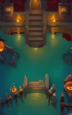 FSJ, A digital illustration of a top - down Halloween game scene. The central focus is a large, stone bridge over a river of blood. On either side of the bridge, there are two small, demon - bat - like creatures perched on the railings. The river is filled with floating, skeletal fish, and there are some old, broken boats in the water. There are also some red - glowing rocks along the riverbanks. The sky is a deep, dark red color, and the atmosphere is eerie and festive. The style is reminiscent of a children's Halloween book.