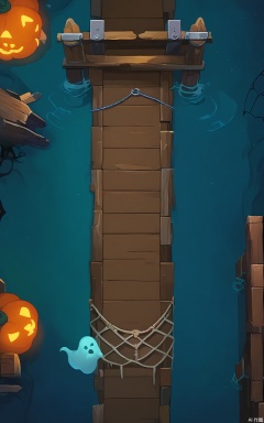 FSJ, A digital illustration of a top - down Halloween game scene. The centerpiece is a long, wooden pier extending into a dark lake. On either side of the pier, there are two small, water - ghost - like creatures rising out of the water. The lake is filled with floating, glowing orbs, and there are some old, sunken boats in the distance. There are also some fishing nets hanging from the pier. The sky is a deep, navy - blue color with a few faint stars, and the atmosphere is eerie and festive. The style is reminiscent of a children's Halloween book.