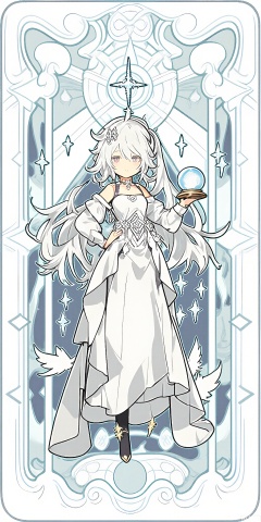TLP, Anime - style drawing of a white - haired girl with long, wavy hair. She's wearing an elegant white and silver gown with a snowflake - shaped hairpin. In her hands, she holds a snow globe and a staff topped with a crystal. The background is a detailed design of white and blue ice crystals and frost patterns, resembling a tarot card. The girl has a tranquil and confident expression and stands in a regal pose, her presence commanding. The art style is clean and detailed, with a fantasy theme.