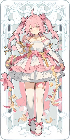 TLP, Anime - style drawing of a pink - haired girl with twin buns. She's wearing a pastel pink and white frilly dress with a ribbon - tied belt. In her grasp, she holds a fan and a small, enchanted book. The background is a delicate pattern of pink and white flowers and vines, resembling a tarot card. The girl has a sweet and serene expression and stands gracefully, her confidence shining through. The art style is clean and detailed, with a fantasy theme.