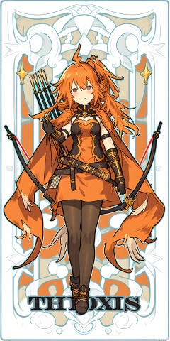 TLP, Anime - style drawing of a orange - haired girl with a high ponytail. She's wearing a vibrant orange and brown leather armor with a feather - trimmed cape. In her grasp, she holds a bow and a quiver of arrows. The background is a detailed design of orange and brown autumn leaves and branches, resembling a tarot card. The girl has a fierce and determined expression and stands ready to draw her bow, her confidence unwavering. The art style is clean and detailed, with a fantasy theme.
