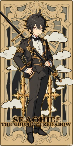 TLP, Anime - style drawing of a black - haired boy with a side - swept fringe. He's wearing a sleek black and gold suit with a dragon - shaped lapel pin. He's clutching a chessboard and a sword. The background is an ornate pattern of black and gold dragons and clouds, akin to a tarot card. The boy has a sharp and confident expression and stands with his hands on his hips, looking down at the chessboard. The art style is clean and detailed, with a fantasy theme.