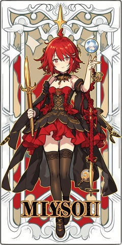 TLP, Anime - style drawing of a red - haired girl with short, spiky hair. She's wearing a crimson and black Victorian - style dress with lace trims and a crescent - shaped pendant around her neck. In her hands, she holds a crystal ball and a dagger. The background is a highly detailed, ornate pattern with red and gold colors, resembling a tarot card. The girl has a determined expression and stands with her feet firmly planted, exuding confidence. The art style is clean and detailed, with a fantasy theme.