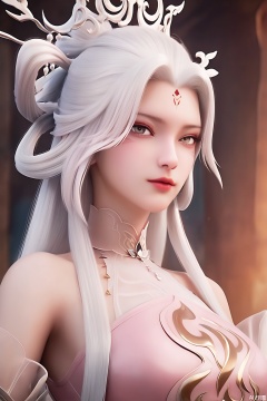 1girl, solo, long hair, looking at viewer, hair ornament, dress, bare shoulders, upper body, white hair, white dress, facial mark, hair rings, forehead mark, pink dress
