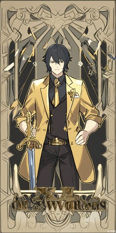 TLP, Anime - style drawing of a black - haired boy with a side - swept fringe. He's wearing a sleek black and gold suit with a dragon - shaped lapel pin. He's clutching a chessboard and a sword. The background is an ornate pattern of black and gold dragons and clouds, akin to a tarot card. The boy has a sharp and confident expression and stands with his hands on his hips, looking down at the chessboard. The art style is clean and detailed, with a fantasy theme.