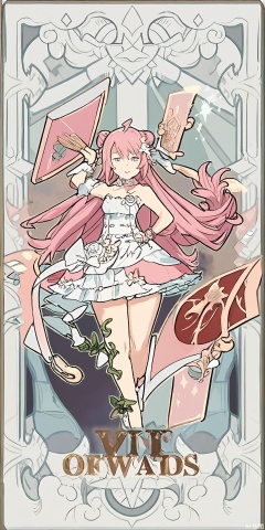 TLP, Anime - style drawing of a pink - haired girl with twin buns. She's wearing a pastel pink and white frilly dress with a ribbon - tied belt. In her grasp, she holds a fan and a small, enchanted book. The background is a delicate pattern of pink and white flowers and vines, resembling a tarot card. The girl has a sweet and serene expression and stands gracefully, her confidence shining through. The art style is clean and detailed, with a fantasy theme.
