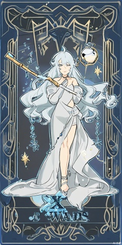 TLP, Anime - style drawing of a white - haired girl with long, wavy hair. She's wearing an elegant white and silver gown with a snowflake - shaped hairpin. In her hands, she holds a snow globe and a staff topped with a crystal. The background is a detailed design of white and blue ice crystals and frost patterns, resembling a tarot card. The girl has a tranquil and confident expression and stands in a regal pose, her presence commanding. The art style is clean and detailed, with a fantasy theme.