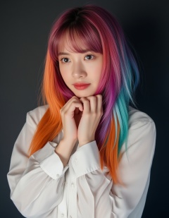 a woman with a rainbow colored hair and a white dress is posing for a picture with a black background and a black background behind her is a black background and a black background with a white and a black background and a white and a white and blue and white background and a black background with a white background and a white and a white and a black and a white and a white image of a woman with a white and a white and a white and a rainbow and a black and a white and a black and a white and a white and a black and a white and a black and a black and a white