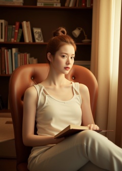 Create a picture of literary and artistic life style, focusing on the characteristics of the characters: bun, white vest, light-colored jeans, sitting posture (hands holding hair, legs crossed), holding a book, and using indoor wooden bookshelves, leisure chairs and warm yellow light and shadow to highlight the delicate texture and leisurely atmosphere of literary and artistic life.
