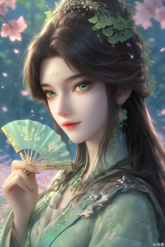 score_9,score_8_up,score_7_up,1girl,looking at viewer,solo,green eyes,facial mark,forehead mark,realistic,happiness,petals,holding fan,folding fan,Folding fan covers half of the face,
