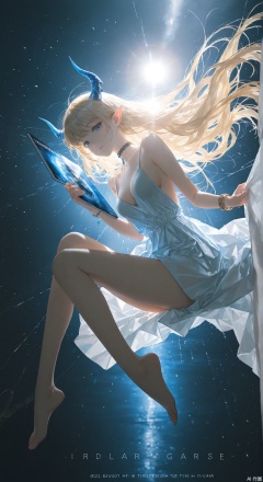 1girl, solo, long hair, breasts, looking at viewer, bangs, blue eyes, blonde hair, dress, holding, bare shoulders, jewelry, very long hair, full body, parted lips, horns, barefoot, choker, pointy ears, white dress, bracelet, feet, english text, bare legs, toes, floating, toenails