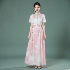 fuzhuang,xiaomei,black hair,hair_bun,grey eyes,fair skin,jewelry,earrings,necklace, 1 girl,solo,pink skirt,skirt,floral print,shirt,long skirt,white shirt,short sleeves,standing,chinese clothes,high_heels,full body,flower,cherry blossoms,green background,cover,gradient background,close-up details,outstanding style,adding a touch of dimension to your images without compromising details,close-up,
