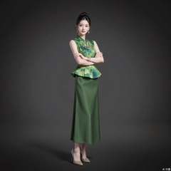 fuzhuang,black hair,hair_bun,grey eyes,fair skin,jewelry,earrings,necklace, 1girl,solo,green shirt,sleeveless,skirt,shirt,green skirt,sleeveless shirt,chinese clothes,long skirt,standing,bracelet,jewelry,crossed arms,china dress,high_heels,black_background,cover,gradient background,close-up details,outstanding style,adding a touch of dimension to your images without compromising details,close-up,