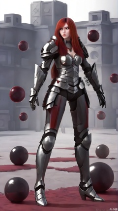 a vibrant red-haired woman stands in a stark contrast of black and silver armor. She is flanked by two large metal objects each with a unique design adding a pop of color to the scene. The woman's body is adorned with a silver necklace adorned with red circles and her long wavy blonde hair cascades down her back. Her left hand is positioned in front of her while her right hand is resting on her hip. To the right of the woman another woman dressed in a metallic armor stands with her arms outstretched. The scene is set against a backdrop of red and gray buildings creating a striking contrast.