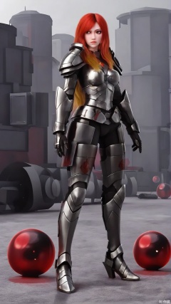 a vibrant red-haired woman stands in a stark contrast of black and silver armor. She is flanked by two large metal objects each with a unique design adding a pop of color to the scene. The woman's body is adorned with a silver necklace adorned with red circles and her long wavy blonde hair cascades down her back. Her left hand is positioned in front of her while her right hand is resting on her hip. To the right of the woman another woman dressed in a metallic armor stands with her arms outstretched. The scene is set against a backdrop of red and gray buildings creating a striking contrast.