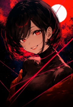 1girl, solo, looking at viewer, dark, darkness, close up, multicolored background, grin, abstract, dutch angle, full moon, jacket, lips, moon, night, night sky, off shoulder, orange jacket, outdoors, red eyes, red sky, red theme, silhouette, sky, smile, swept bangs, thread, turtleneck,masterpiece, high score, great score, absurdres