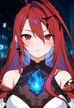 1girl, elizabeth rose bloodflame, elizabeth rose bloodflame \(1st costume\), hololive, hololive english, ahoge, blue hair, blush, colored inner hair, cross, cross earrings, earrings, hair between eyes, jewelry, long hair, multicolored hair, parted lips, red eyes, red hair, solo, virtual youtuber, night, street, masterpiece, high score, great score, absurdres