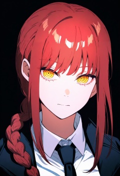 1girl, makima \(chainsaw man\), chainsaw man, sensitive, braid, braided ponytail, closed mouth, expressionless, collared shirt, long hair, looking at viewer, necktie, red hair, ringed eyes, shirt, sidelocks, solo, yellow eyes,black background, glowing eyes,masterpiece, high score, great score, absurdres