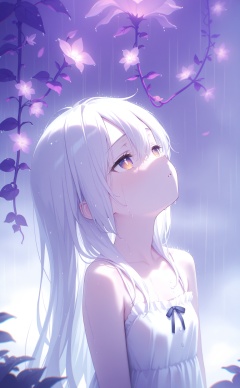 masterpiece,very aware,highres,absurdres,newest,best quality,loli,petite,high quality,chromatic_aberration,//,illustration,ultra detailed,hdr,Depth of field,(colorful),loli,white background,Dundar effect,a lot of purple vines,vines covering half of the painting,delicate plant details,a girl,girl,petite girl,long white hair,golden pupils,white dress,bare feet,side,side,upper body,head up,sad eyes,rain,light,figure light,petals,purple filter,left,fog,dream,unreal,Blur,float light,//,<lora:konya_karasue——【noob】hans:0.8>,