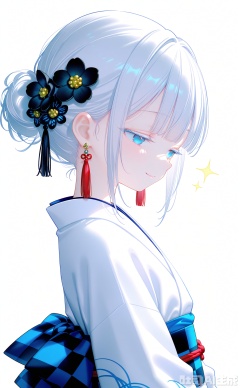 1girl,solo,japanese clothes,kimono,flower,hair ornament,white background,jewelry,white kimono,hair flower,earrings,blue eyes,sash,tassel,obi,black flower,simple background,smile,upper body,back bow,tassel earrings,white hair,sparkle,closed mouth,from side,bow,lace trim,colored eyelashes,black bow,short hair,frills,looking to the side,hair bun,half-closed eyes,blunt bangs,sidelocks,checkered bow,