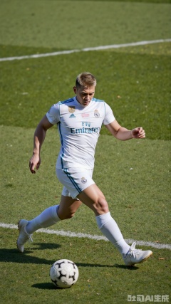 On the sun-drenched grass pitch, the blond player glides into the penalty area as lightly as a cheetah. white jersey,He arches his back slightly, lowers his center of gravity, and his muscular lines shimmer faintly in the sunlight. His powerful thighs form a graceful arc, and with a deft inward turn of his ankle, he precisely traps the speeding football at his feet. In that instant, he seems to merge with the ball. His knee-high white socks glimmer in the sunlight, while faint cheers drift from the stands, mingling with the scent of grass and sweat in the air, jointly freezing this wonderful moment on the green pitch..,jzns