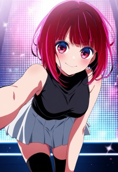 1girl, arima kana, oshi no ko, anime coloring, bent over, black shirt, black thighhighs, bob cut, breasts, closed mouth, inverted bob, looking at viewer, pleated skirt, red eyes, red hair, shirt, short hair, skirt, sleeveless, sleeveless shirt, smile, solo, thighhighs, white skirt,stage, masterpiece, high score, great score, absurdres