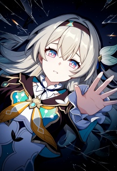 1girl, firefly \(honkai: star rail\), honkai: star rail, black hairband, black jacket, blonde hair, blue eyes, broken glass, cable, cracked, cracked glass, cracked screen, dark, dutch angle, frilled shirt collar, frills, hairband, jacket, light particles, long hair, looking at viewer, looking to the side, lying, multicolored eyes, neckerchief, on back, parted lips, pink eyes, reaching towards viewer, open hand, sad, solo, two-tone eyes, upper body, yellow neckerchief, masterpiece, high score, great score