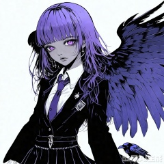 qzfp, Raven,1girl, purple hair, purple eyes, bangs, jk uniform, wings,crow on shoulder
