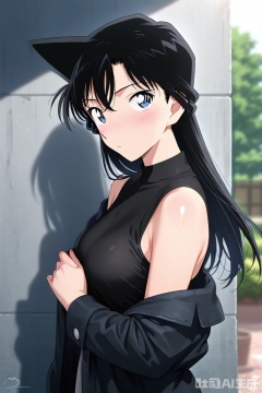 masterpiece,best quality,amazing quality, 1girl,solo,long hair,against wall,looking at viewer,from side,blue eyes,closed mouth,bangs,jacket,outdoors,black hair,off shoulder,upper body,sleeveless,shirt,floating hair,blurry,standing,blurry background,long sleeves,hair between eyes,sleeveless shirt,black shirt,black hair,shiny hair,signature,growing,,maolilan