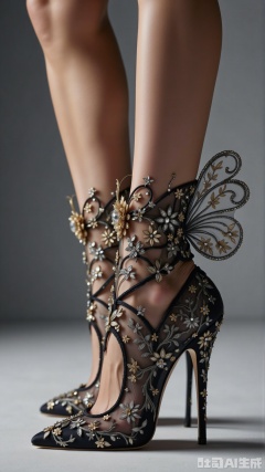 crystal-carved high heels, A lady's legs are wearing crystal - carved high heels. Black yarn embroidered with golden flowers, and gray yarn butterfly decorations are agile, mysterious and exquisite.