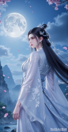 "An exquisite Chinese goddess standing under the moon, wearing a light blue hanfu with silver embroidery, delicate silver phoenix hair accessories, flowing black hair, surrounded by cherry blossom petals, misty mountain background, soft cinematic lighting, ultra-detailed textures, wuxia fantasy style, trending on ArtStation, 8K resolution --ar 16:9 --v 6.0"