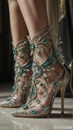 Ink Wash Painting,She stands at the threshold, crystal heels shimmering like frozen moonlight. The mesh is dotted with blue-green enamel motifs, shaped like minuscule bird wings that seem to pulse with breath. As she turns, the gems in the heels catch the chandelier’s glow, spilling teal and emerald reflections across her satin-clad calves. Her back is straight, chin tilted—every line of her silhouette a testament to the shoes’ ethereal opulence.,crystal-carved high heels