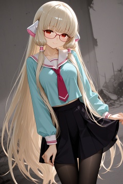 masterpiece,best quality,highly detailed,darkness,1girl,Chii,Chobits,school_uniform,black_skirt,perfect_black_pantyhose,light_blue_shirt,shy,smile,glasses,