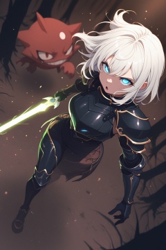 masterpiece,best quality,amazing quality,very aesthetic,absurdres,newest,in the style of fashion photography,light particles,cinematic lighting,Visual impact,sharp focus,Emotionalization,depth of field,dynamic pose,dutch angle,extreme aesthetic,scenery,,from_above,anime girl,glowing green sword,dark forest background,intense gaze,wind blowing through hair,dynamic lighting,dramatic pose,armor,fantasy setting,intricate details,raise your weapon,brandishing a weapon,fu_r_y,:o,shoutmon,