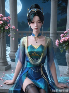 score_9,score_8_up,score_7_up,1girl,looking_at_viewer,realistic,1girl,Vivid Colors,bright environment,delicate water,hair_ornament,shiny skin,reflection,dress,flower sea,falling petals,extreme detail description,(upper body:0.8),put one hand on your side,long_hair,(skindentation:1.3),bright,sunshine on face,light,dress,sitting_down,eyes highlight,thighhighs,petals,night,expressionless,chinese clothes,pillar,full moon,moonlight,moonlight