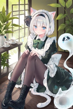 masterpiece,best quality,high quality,(colorful),[Artist miwano rag],[Artist wlop],[Artist chen bin],loli,nai3 Style, 1girl, konpaku youmu, animal ears, pantyhose, cat ears, konpaku youmu (ghost), maid, solo, blue eyes, blush, alternate costume, enmaided, maid headdress, black footwear, short hair, boots, apron, tail, sitting, cat tail, bow, long sleeves, bowtie, closed mouth, maid apron, knees up, kemonomimi mode, frills, cross-laced footwear, black pantyhose, looking at viewer, white hair, black dress, green bow, green bowtie, dress, ghost, animal ear fluff, white apron, extra ears, full body, plant, lace-up boots, hitodama, indoors, ribbon, black hairband, hair ribbon, bob cut, cup, cat girl, hands on own knees, frilled apron