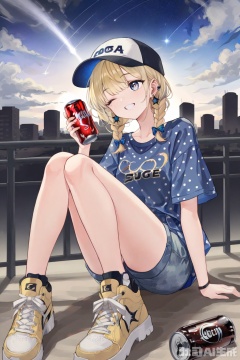 (masterpiece),(best quality),1girl, arm_support, baseball_cap, blonde_hair, blue_eyes, blue_sky, bottle, braid, can, cloud, cloudy_sky, condensation_trail, day, denim, ear_piercing, earrings, fence, hat, heart_print, holding_can, jewelry, leopard_print, long_hair, night, night_sky, one_eye_closed, outdoors, piercing, polka_dot, polka_dot_bow, polka_dot_dress, polka_dot_shirt, polka_dot_skirt, railing, shirt, shoes, shooting_star, short_sleeves, shorts, sitting, sky, smile, sneakers, soda_can, solo, star_\(sky\), star_\(symbol\), star_print, starry_sky, starry_sky_print, teeth