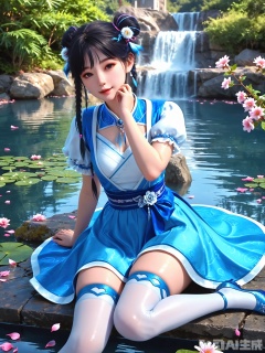score_9,score_8_up,score_7_up,1girl,looking_at_viewer,realistic,1girl,Vivid Colors,bright environment,delicate water,hair_ornament,shiny skin,reflection,dress,flower sea,falling petals,extreme detail description,(upper body:0.8),put one hand on your side,long_hair,(skindentation:1.3),bright,sunshine on face,light,dress,sitting_down,eyes highlight,thighhighs,petals,