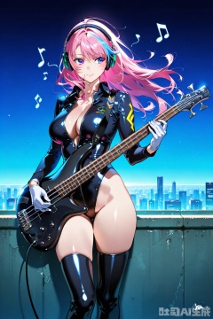 (1woman playing bass guitar),solo,standing,dynamic pose,dynamic front,beautiful eyes,wind,big breasts,streaked long hair,glossy leather long Sleeve,Open collar,shiny sliver bare hip unzipped cutouts on sides leotard,white gloves,lovestruck,headphone,thighboots,swirling musical notes,cityscape,horizon,cyberpunk,textures,detailed texture,very detailed face,masterpiece,best quality,good quality,very aesthetic,newest,