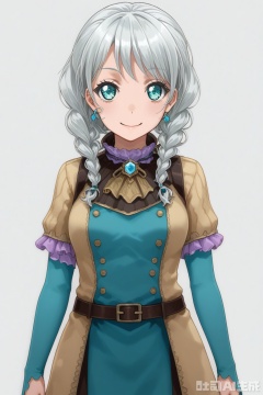 looking at viewer,Wakamiya Eve, long hair, smile, bangs,blue eyes, braid, white hair,twin braids,aqua eyes,  hair over shoulder