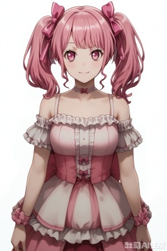 looking at viewer,Maruyama Aya,bangs,pink eyes,pink hair,hair ribbon,twintails