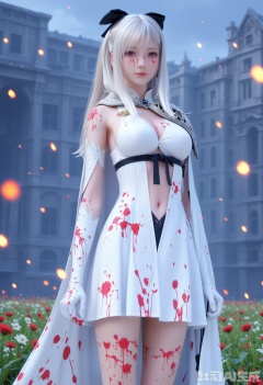 1girl,Zero Drakengard 3,1girl, solo, long hair, breasts, pink eyes, looking at viewer, gloves, dress, bow, navel, cleavage, white hair, hair bow, socks,white gloves, cape, white dress, clothing cutout, black bow,((empty-handed:1.5)),