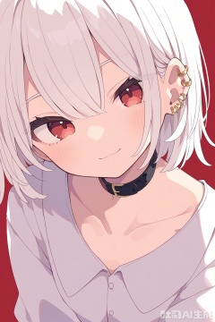 1girl,solo,red background,red eyes,earrings,jewelry,white hair,simple background,looking at viewer,shirt,upper body,short hair,blush,smile,piercing,collar,ear piercing,choker,white shirt,hair between eyes,closed mouth,collarbone,head tilt,long sleeves,red theme,