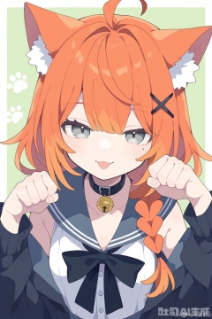 1girl, animal ears, tongue, solo, neck bell, tongue out, bell, hair ornament, sailor collar, green background, paw pose, collar, braid, upper body, looking at viewer, bow, hairclip, multicolored hair, mole under eye, weibo username, collarbone, jacket, hair between eyes, streaked hair, animal ear fluff, sleeveless, shirt, black collar, long hair, white hair, x hair ornament, bowtie, off shoulder, orange hair, blue sailor collar, ahoge, weibo logo, cat ears, black bow, black jacket, long sleeves, mole, open clothes, white shirt, buttons, :p, hair over shoulder, single braid, sleeveless shirt, eyelashes, choker, simple background, open jacket, black bowtie, bare shoulders, white border, hands up, grey sailor collar, breasts, black choker, jacket partially removed, half-closed eyes, jingle bell, two-tone background, grey eyes, virtual youtuber