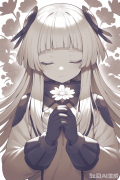 1girl, solo, long hair, bangs, simple background, gloves, long sleeves, white background, monochrome, closed eyes, upper body, flower, black gloves, own hands together